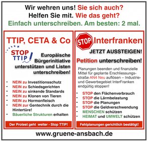 Das zweite, sehr wichtige Thema des Infostandes war die Petition gegen das Gewerbegebiet Interfranken, bzw. gegen die geplante ErschließungsstraßeAN4 Neu. Diese Kreisstraße AN4 Neu will die Mehrheit der Kreistagsmitglieder von CSU und SPD für die Erschliessung des gerichtlich gescheiterten Gewerbegebietes des Zweckverbandes Interfranken bauen. Nach dem der Bebauungsplan von BN und Bürgerforum Wörnitztal gerichtlich erfolgreich beklagt und vom Verwaltungsgericht München für ungültig erklärt worden ist, fordern wir die Kreisräte des Landkreises Ansbach auf die KreisstraßeAN4 Neu entgültig zu begraben. Es geht mindestens um 15 Mio € Staatsgelder. Dieses Geld wollen wir für sinnvollere Dinge ausgeben. Die Neuordnung des Kreisstraßennetz und der Bau der KreisstraßeAN4Neu ist deshalb unnötig. Haben Sie schon unterschrieben? Wenn nicht können Sie hier die Unterschriftenliste herunterladen und anschließend ins Grünen Büro nach Ansbach schicken.