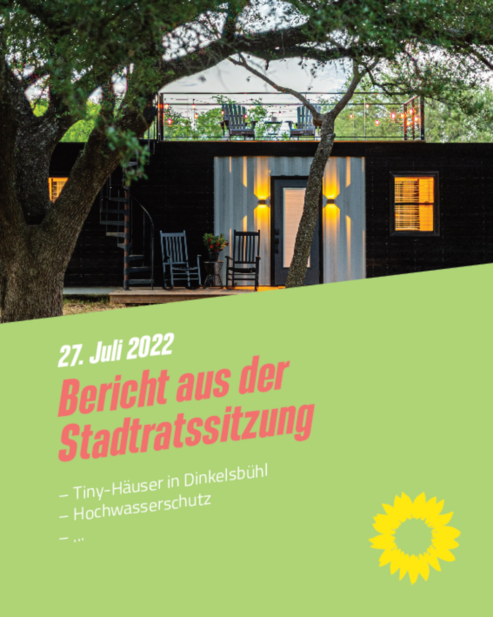Auf dem etwa 2000m2 große Grundstück östlich des Campingplatzes, dessen Eigentümerin die Stadt Dinkelsbühl ist, soll eine Tinyhaussiedlung entstehen. Über 70 Bewerbungen gibt es laut Aussage von Oberbürgermeister Dr. Hammer bereits für Tinyhäuser in Dinkelsbühl. Der Stadtrat hat sich nun einstimmig dazu entschieden, ein Architekturbüro mit der Überplanung des Grundstücks zu beauftragen. Wir Grünen halten die Tinyhäuser für eine platzsparende und nachhaltige Form zu wohnen und unterstützen das Vorhaben. Ein Bebauuungsplan wäre aus unserer Sicht noch besser geeignet gewesen um das Gebiet zu Ordnen und Gestaltungsregeln festzusetzen.
