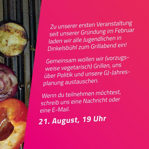 Am 21. August wollen wir uns zu unserer ersten Veranstaltung nach dem Corona-Lockdown treffen und gemeinsam grillen. Schreib uns eine Nachricht an gj.dkb@gruene-ansbach.de wenn du auch kommen möchtest.