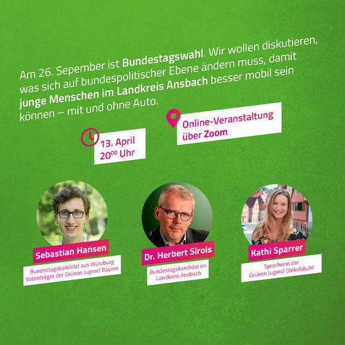 Es soll debattiert werden, welche Weichen im Bund gestellt werden müssen, damit junge Menschen auf dem Land mobiler sind. Mit von der Partie sind Kathi Sparrer, Sprecherin der GJ-Dinkelsbühl, Herbert Sirois, Grüner Direktkandidat LK Ansbach für den Bundestag, und Mobilitätsexperte Sebastian Hansen, Votenträger der GJ-Bayern, Gemeinderat und Kreisrat aus Waldbüttelbrunn (Nähe Würzburg).