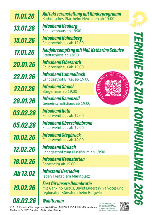Wir laden die Bevölkerung ein auf die Erfolge unserer Stadtratsarbeit 2020-2026 zurückzublicken, gemeinsam über Handlungsbedarfe zu diskutieren und gemeinsame Zukunftsideen für unsere Heimat zu entwickeln. Die Ergebnisse fließen in unser Wahlprogramm für den nächsten Stadtrat 2026-2032 ein.