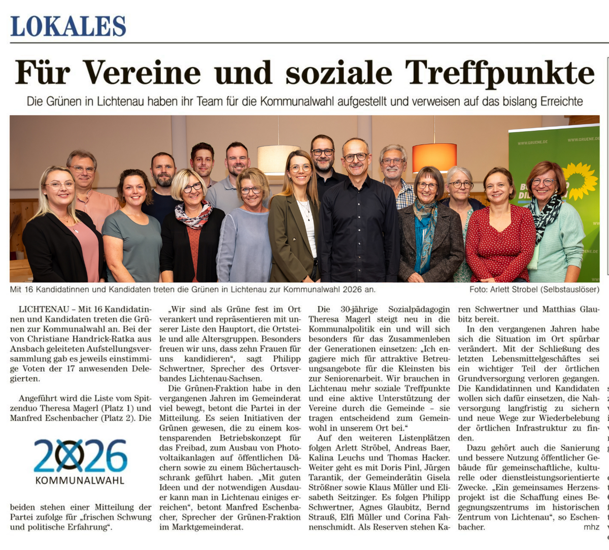 Die bisherige Sprecherin Corina Fahnenschmidt trat nicht mehr an, für Sie rückte Stefanie Radinger aus Sachsen nach. Neuer Sprecher ist nun Philipp Schwertner aus dem Lichtenauer Ortsteil Rückersdorf, der Manfred Eschenbacher in diesem Amt nachfolgt. Eschenbacher bleibt als Schriftführer im Vorstand, wird aber künftig einen größeren Schwerpunkt auf die Gemeinderatsarbeit legen. Neu im Vorstand ist Agnes Glaubitz aus Lichtenau. Die selbständige Hebamme wurde als Beisitzerin einstimmig gewählt. Für das laufende Jahr sind bereits zahlreiche Veranstaltungen geplant. Neben den regelmäßigen Stammtischen wird es u.a. zwei Ferienspass-Aktionen, Führungen und Vorträge geben. „Besonders stolz sind wir auf unsere sehr engagierte Gemeinderatsfraktion in Lichtenau“ so der frischgebackene Sprecher Philipp Schwertner. Mit großem Engagement und gut ausgearbeiteten Anträgen wurden bereits viele Impulse in den Bereichen Schwimmbad, Energieversorgung und Förderung des Ehrenamts gegeben.