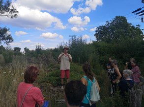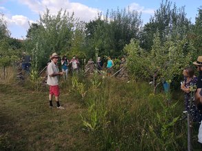 Beyerberg - Markus Gastl, der Erfinder des 3-Zonen-Garten-Konzepts und bekannter Experte in der grünen Garten-Szene begrüßte fast 20 Gäste aus Lichtenau zu seiner Führung. Mit viel Elan und Leidenschaft führte er die Besucher*innen durch sein 7.000 Quadratmeter großes Gartenparadies. Eine fette und gedüngte Wiese ("das war mal die beste Wiese von Beyerberg...") verwandelte er in ein artenreiches Gelände, auf dem es viel zu entdecken gab. "Die Nachbarn haben mich für verrückt erklärt, als ich 30 Lastwagen besten Humus abtransportieren ließ", so Gastl. Auf dem dann mageren Boden entwickelte sich über die Jahre eine faszinierende heimische Pflanzenwelt. Der Garten ist durch die sog. Pufferzone, einen Bereich aus Hecken und Totholz eingefasst und besitzt neben artenreichen Hotspotzonen in dem sich zahlreiche Insekten tummeln auch eine Ertragszone für den Gemüseanbau. Neben vielen Informationen über den Garten berichtete Gastl auch über seine monatelange Reise mit dem Rad von Feuerland nach Alaska und bezog in seiner Führung oft Stellung zum vielfach zerstörerischen Tun der Menschen.