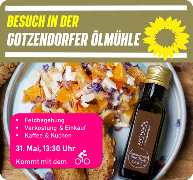 Wir besuchen die Ölmühle in Gotzendorf und beginnen mit einer Feldbegehung. Anschließend lernen wir die Mühle kennen, können Öle und andere Produkte verkosten und im Hofladen kaufen. Bei Kaffee und Kuchen beenden wir die Veranstaltung nach ca. 2 Stunden. Kommt gerne mit dem Fahrrad nach Gotzendorf!