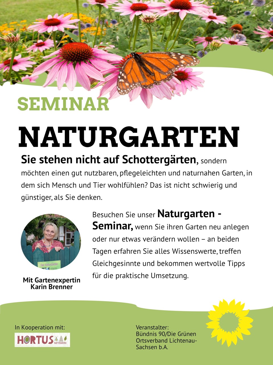 Mit Gartenexpertin Karin Brenner. Für alle, die sich für eine naturnahe Gestaltung ihres Gartens interessieren. Sowohl für die Neuanlage als auch Anregung zur Veränderung eines bestehenden Gartens. Das zweiteilige Seminar besteht aus einer Gartenführung in Oberdachstetten und einem Seminar in Lichtenau oder Sachsen. Themen u.a.: Staudenbeet, Blühflächen, Hecken und Gehölze und v.m.
