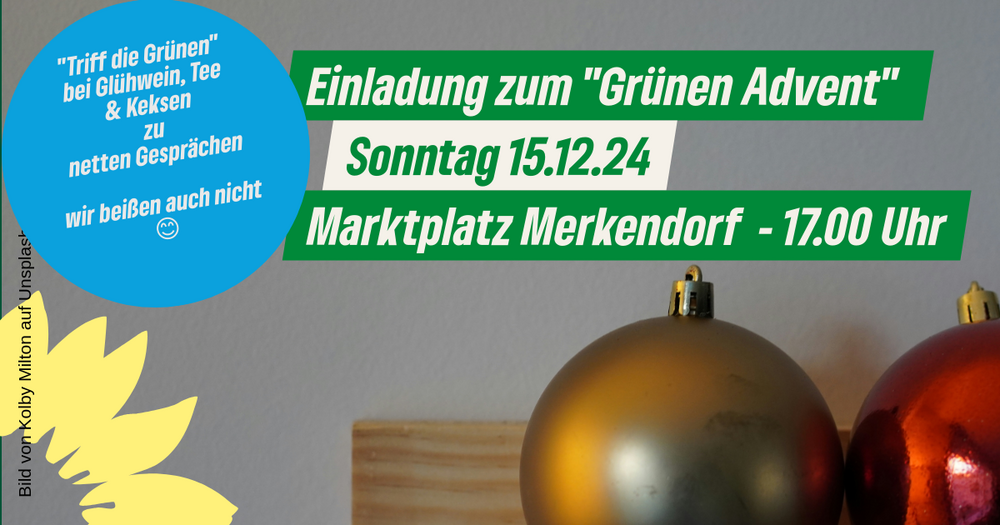Kommt vorbei und trefft die Grünen ab 17.00 Uhr am Marktplatz bei Glühwein, Tee und Plätzchen.