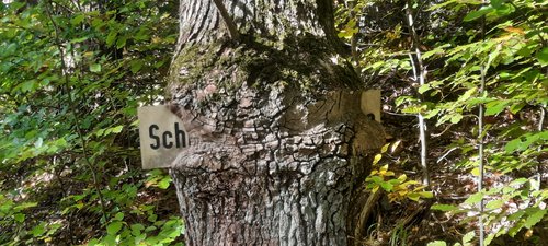 Aus forstwirtschaftlicher Sicht bringen Laubbäume zwar einige Nachteile mit sich, z.B. die lange Dauer bis zur „Reife“ oder der nicht ganz so gerade Wuchs, haben aber größere Überlebenschancen und tragen mehr zur Artenvielfalt und zum Grundwasserschutz bei. Manche Exemplare scheinen sich sogar einen Spaß zu erlauben, wie die Eiche im Nägeleinsrangen, die dort ein Verkehrsschild „verschluckt“ hat.