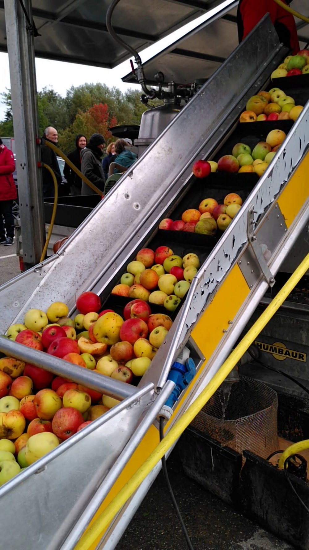 So kam es, dass am 3. Oktober 2020 vom Nachmittag bis in den Abend reges Treiben vor dem RKW-Werk herrschte. Schwer beladen mit Äpfeln standen Fahrzeuge und Anhänger Schlange vor der Presse. Wartende und Schaulustige konnten dabei zusehen, wie die Äpfel mit dem Förderband in die Presse gehoben und als Saft sowie Trester wieder von ihr ausgegeben wurden. Wer Äpfel anlieferte, bekam seinen Saft direkt mit nach Hause. Den Trester übernahmen die örtlichen Jäger für das „Ankirren“ des Wildes.