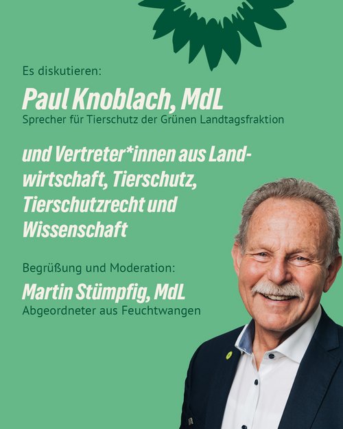 Martin Stümpfig MdL lädt deshalb, gemeinsam mit seinem Kollegen Paul Knoblach MdL, Sprecher für Tierschutz, im Namen der Fraktion Bündnis 90/DIE GRÜNEN zu dieser Veranstaltung ein.