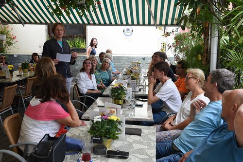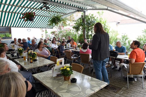 Im Biergarten einer heimischen Pizzeria traf er auf rund 40 interessierte Besucher.