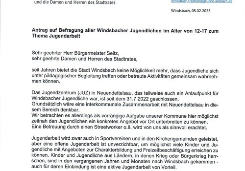 Mehr Windsbach: in der kommenden Sitzung des Ausschusses für Bildung, Familien, Jugend, Senioren und Sport am Mittwoch, den 26.07.2023 um 19:30 Uhr wird ein Antrag der Fraktion Bündnis 90/Die Grünen zum Thema Jugendarbeit behandelt. Konkret geht es um die Erarbeitung einer…