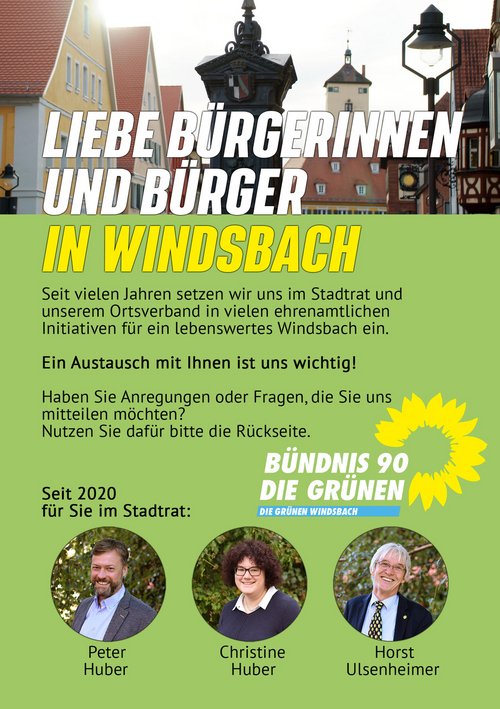 seit vielen Jahren setzen wir Grüne uns im Stadtrat und im Ortsverband in vielen ehrenamtlichen Initiativen für ein lebenswertes Windsbach ein.