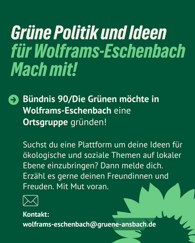 In der Gemeinde Wolframs-Eschenbach entsteht derzeit eine Ortsgruppe. Wenn du dich hier einbringen möchtest dann schreibe am besten die Aktiven vor Ort an: wolframs-eschenbach (a) gruene-ansbach.de